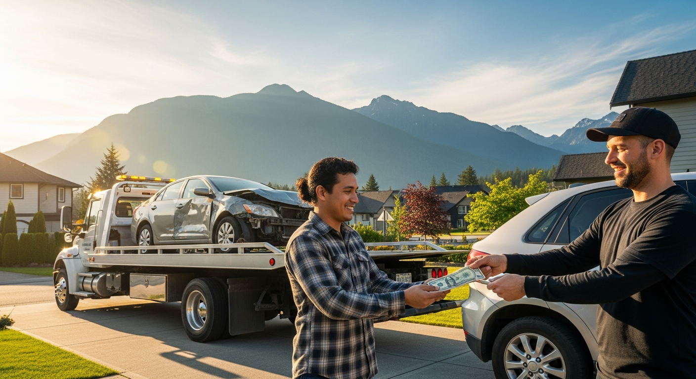 Call (604) 398-5218 for an instant quote — free towing anywhere in the Lower Mainland, cash paid on pickup. We come to your address.
